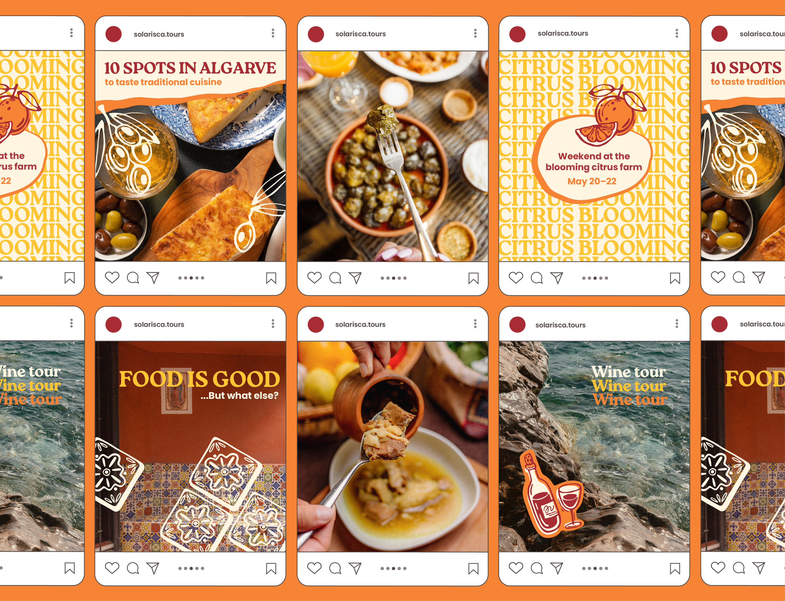 A handcrafted visual system features an illustrative logo and graphic elements inspired by traditional Portuguese pottery and regional products, ensuring a warm, earthy aesthetic that aligns with Solarisca’s values.